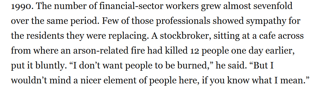 “这些职业人士很少对他们取代的那些原住民表示同情。一名股票交易员,坐在一间咖啡厅看着对面的街区,那里前一天刚发生了一场纵火,烧死人。他很直白地说:‘我不想人们被烧死,但我不介意来一点人的要素,如果你明白我在说什么。’”
